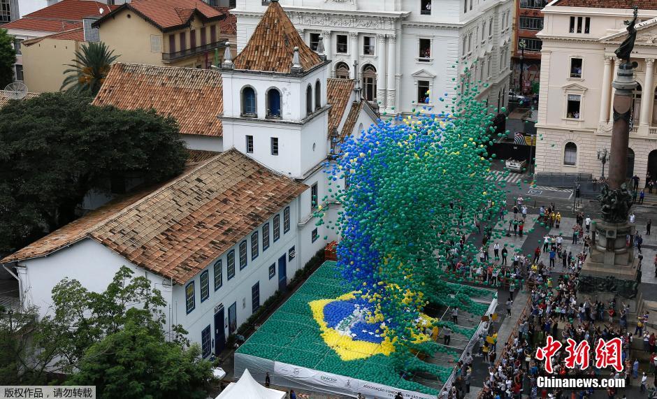当地时间12月30日,巴西圣保罗,数千个可生物降解气球拼成巴西国旗图案,一起放飞庆祝新年。
