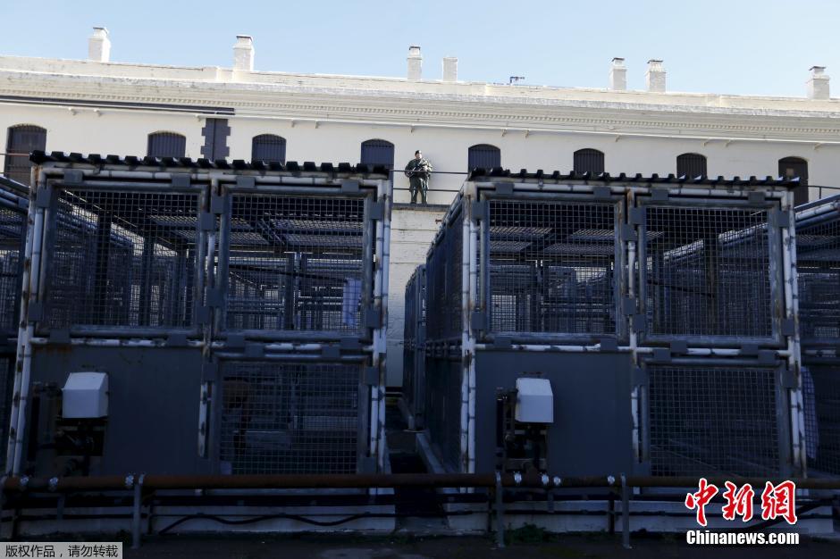当地时间12月29日,摄影师拍摄的美国加利福尼亚州圣昆丁州立监狱死囚牢房。该牢房位于旧金山湾区并以其古老历史和囚禁过许多重刑犯著称。图为监狱守卫在放风区域持枪警戒。