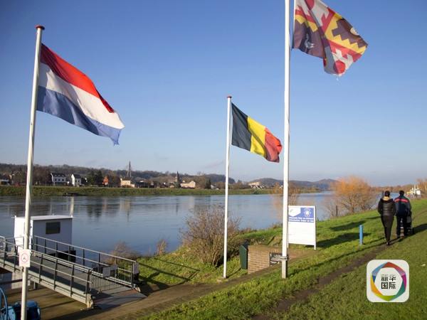 荷兰艾斯登镇,码头两侧竖立着荷兰国旗(左)和比利时国旗(中)。(图片来源:新华/美联)