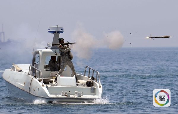 2010年5月10日,伊朗士兵在霍尔木兹海峡与阿曼海举行的军事演习上发射火箭弹。(图片来源:新华/路透)