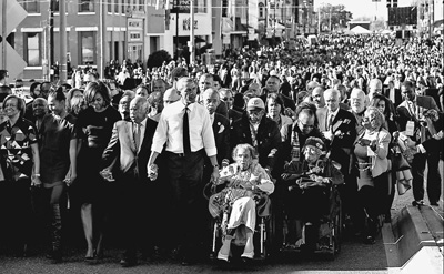 二○一五年三月,在美国亚拉巴马州塞尔马,美国总统奥巴马(中)参加美国黑人民权运动五十周年纪念活动。奥巴马说,美国社会种族歧视和偏见并没有被消除。资料图片