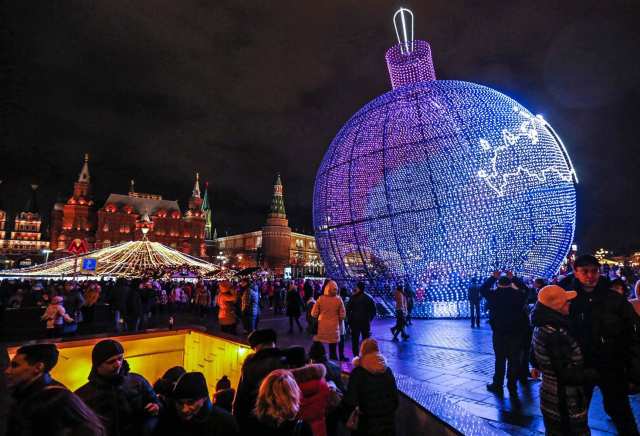 图为12月26日,莫斯科市民在驯马场广场观赏圣诞和新年彩灯。(图片来源:新华/欧新)