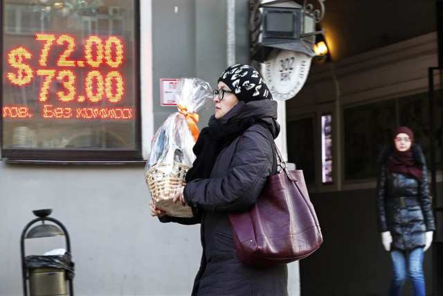 图为12月29日,莫斯科市中心,一名妇女抱着礼品篮走过一块显示卢布对美元汇率的电子屏。(图片来源:新华/欧新)