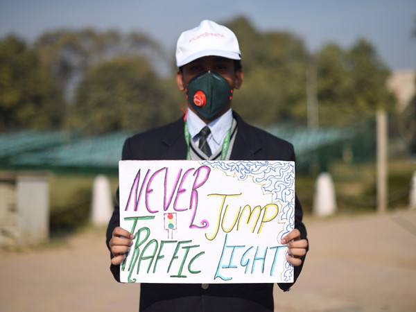 印度警察和志愿者走上街头,查找违章车辆;一些儿童志愿者戴着口罩,举着呼吁司机遵守规定的标语。