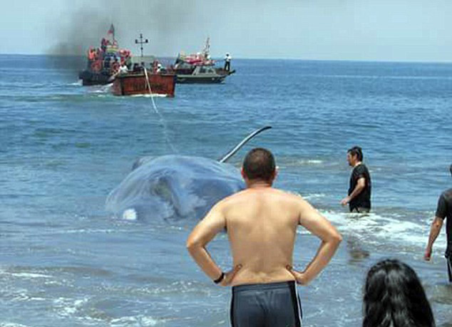 生死营救!20米长搁浅鲸鱼被智利渔民合力拖入海中