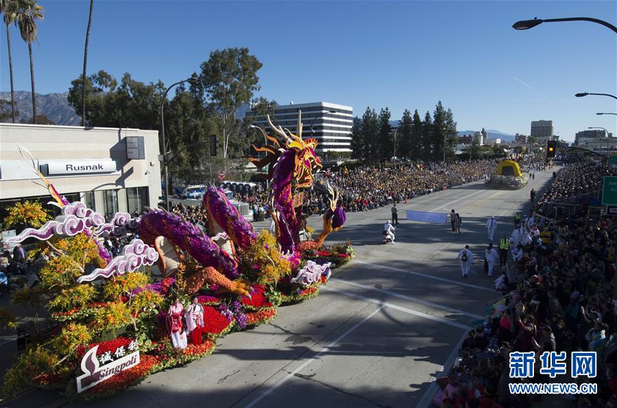 1月1日,美国洛杉矶帕萨迪纳市,玫瑰花车游行队伍经过科罗拉多大道。当日,美国洛杉矶帕萨迪纳市举行第127届新年玫瑰花车游行。玫瑰花车游行每年元旦在帕萨迪纳举行,今年的主题是“发现你的冒险”。新华社记者杨磊摄