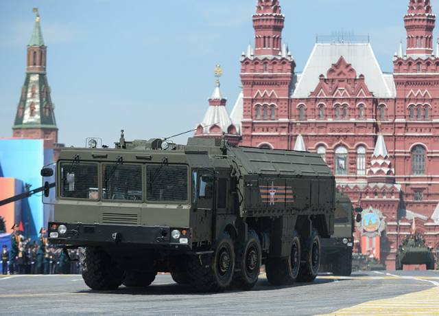 图为2015年5月9日,在俄罗斯首都莫斯科红场,“伊斯坎德尔”战术导弹系统行进在阅兵式上。(图片来源:新华社)
