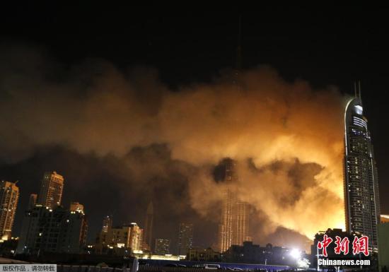 资料图:当地时间12月31日晚,阿拉伯联合酋长国最大城市迪拜市中心世界最高楼迪拜哈利法塔附近一高层酒店突发大火。