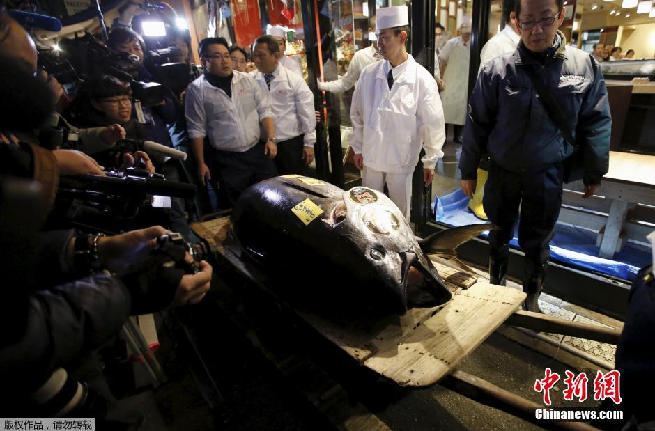 当地时间2016年1月5日,日本东京,筑地水产市场迎来了2016年的首个交易日,在开市前就有不少客人来预定这里著名的蓝鳍金枪鱼,而其中最大的一条金枪鱼被寿司连锁店“寿司三昧”的老板Kiyoshi Kimura拍得,这条重达200公斤(约400磅)的蓝鳍金枪鱼成交价为1400万日元(约765800元,人民币)。