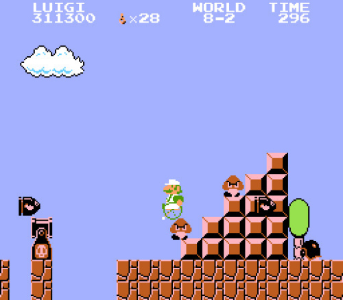 阻碍物前加装了斜板坡道,让坐轮椅的马里奥轻松越过。“问号”下面又有升降板,让他不用跳起便可顶出“变大蘑菇”,直至最后到达终点旗杆,更有升降机让他徐徐降落地面,顺利过关。
