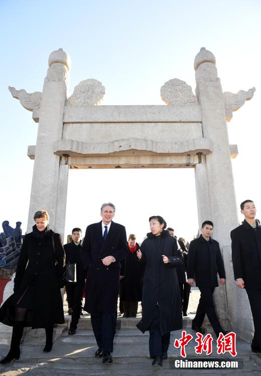 1月6日,正在中国访问的英国外交大臣菲利浦·哈蒙德在位于北京的天坛公园参观。 中新社记者 侯宇 摄