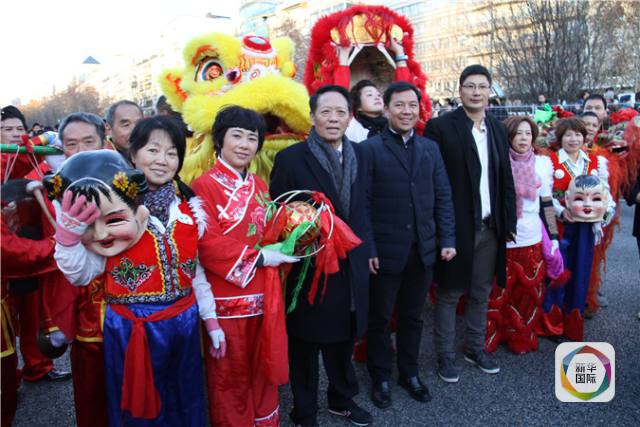 图为华人方阵在庆祝活动中合影。(新华社记者冯俊伟摄)