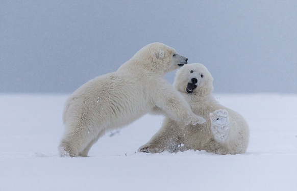 在这组照片中,一对北极熊幼崽兴奋地在雪地上滚来滚去,时而保持“战斗状态”扭打在一起,时而拥抱或亲吻对方,时而又跑到母亲面前恶作剧地吐舌头搞怪,好不欢乐,貌似自在孩童。