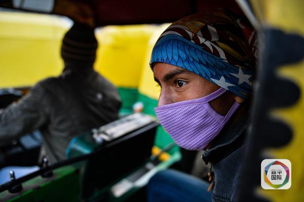 图:12月17日,印度新德里遭遇雾霾天,一名带着口罩的游客坐在三轮摩托车上。