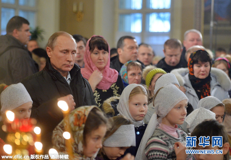 当地时间2016年1月7日,俄罗斯特维尔州,俄罗斯总统普京与孩子们一同在当地教堂参加圣餐仪式,庆祝东正教圣诞节。图片来源:东方IC