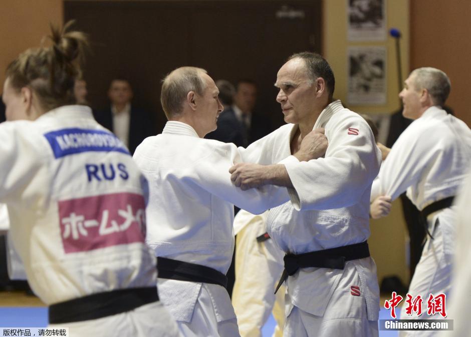当地时间1月8日,俄罗斯索契,普京视察俄柔道国家队南部训练中心,期间与伦敦奥运会柔道冠军等顶尖高手同台切磋技艺。