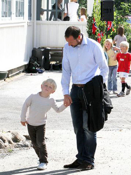 当地时间2011年8月18日,挪威开学第一天,挪威王储哈康送小王子斯维尔马格努斯去上学。