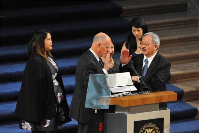 图为华人市长李孟贤(前右)在旧金山市政厅由加利福尼亚州州长杰里·布朗(前左)引领,宣誓连任就职。(新华社记者 徐勇摄)