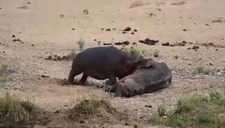 日前,在南非最大的野生动物园克鲁格国家公园里的一处沙滩上,一只河马在打败了一只野牛之后,疯狂地撕咬这个竞争者的尸体,来炫耀自己在那片领地上的霸主地位。