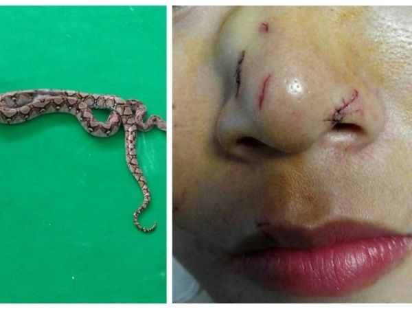 在泰国普吉咬伤中国游客的涉事蟒蛇和被蛇咬伤的中国女游客。