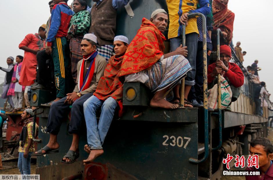 地时间1月10日,孟加拉国达卡大批穆斯林信徒在参加完世界穆斯林大会后乘火车离开,火车上拥挤不堪人山人海,甚至连车顶也坐满人。