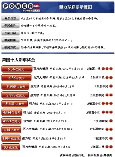 “强力球”是美国最受欢迎的彩票游戏之一,在美国44个州以及华盛顿—哥伦比亚特区等地区发售,每周三和周六开奖。中大奖的幸运儿有两种领奖方式,一种是一次性领完,但是无法领取全额且需缴税;另一种是29年内分期领取全额。