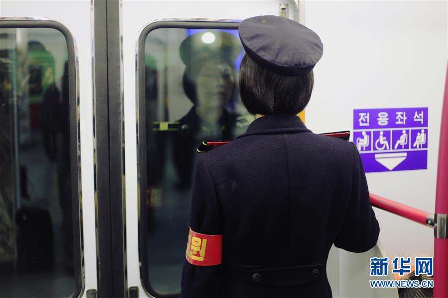在朝鲜首都平壤,一名女列车员站在新建造的地铁列车中。此前的旧列车中并未设置列车员(1月6日摄)。据朝中社报道,由朝鲜金钟泰电力机车联合企业制造的新型地铁列车于1月1日开始正式运行。目前平壤地铁只更换了一列新车,每日限时段运行,其他时段和车次仍由旧列车运行。新华社记者朱龙川摄