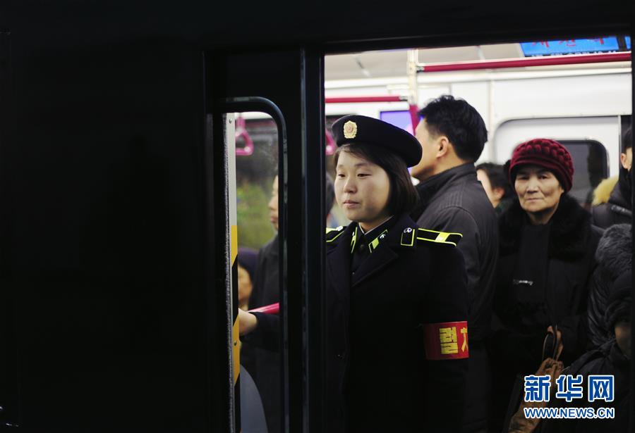 在朝鲜首都平壤的凯旋地铁站,新建造的地铁列车正在关门(1月6日摄)。据朝中社报道,由朝鲜金钟泰电力机车联合企业制造的新型地铁列车于1月1日开始正式运行。目前平壤地铁只更换了一列新车,每日限时段运行,其他时段和车次仍由旧列车运行。新华社记者朱龙川摄
