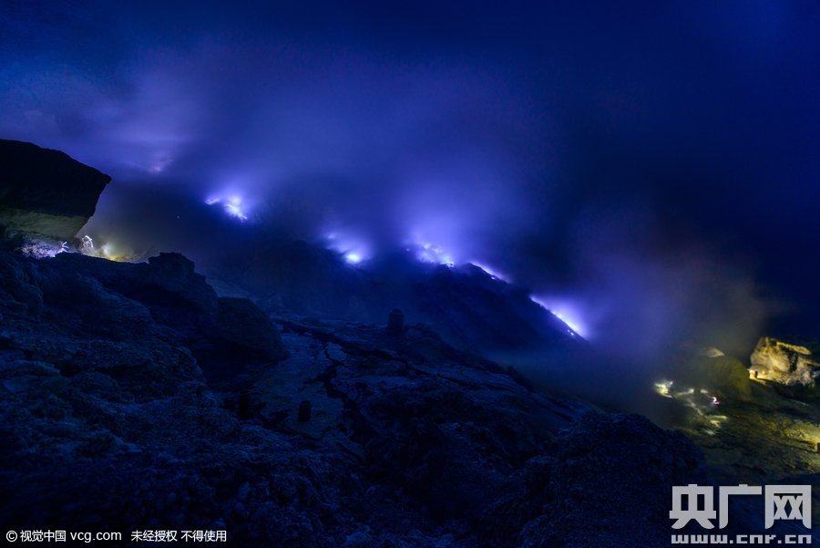 实拍印尼瓦伊真火山 夜间喷发5米高蓝色火焰