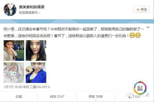 新华网北京1月12日电 最近网上出了这么一件事儿。郑州有个妹子发微博自曝,因肥胖被前男友嫌弃分手后自强抽脂,作出“人油肥皂”一枚,“送给那些以貌取人的渣男们一份礼物!”