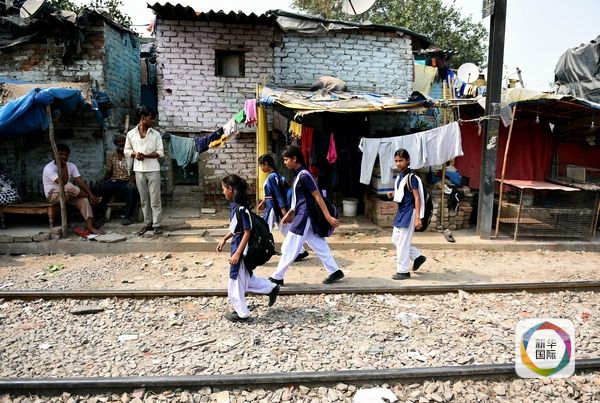 2015年10月13日,印度新德里贫民区,几名少女走在铁路轨道中。(图片来源:新华/法新)