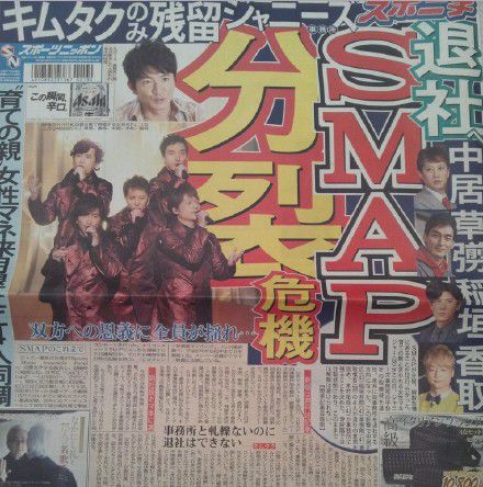 Sponichi Annex网站报道称,SMAP的女经纪人已于12日辞去杰尼斯事务所子公司J-dream董事一职。受此影响,SMAP成员中居正广、稻垣吾郎、香取慎吾、草彅刚等四人也表示会离开杰尼斯,木村拓哉则决定留下。在这种情况下,SMAP将难摆脱解散的命运。