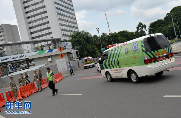 1月14日,在印度尼西亚首都雅加达,警察在爆炸现场附近戒严。印度尼西亚首都雅加达14日上午发生数起爆炸,造成至少7人死亡。警方同武装分子发生交火。印尼总统佐科对这种“恐怖行为”表示谴责。新华社记者贺长山摄
