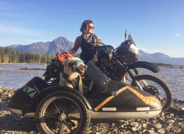 她帅气的“机车犬”贝勒因此在网上可算是火了一把!这条训练有素的拉布拉多犬,头戴潜水镜,一本正经地坐在侧三轮摩托车的一侧,陪着女主人上高山,下深河,渡险滩等等,与她一起体验路上的生活。