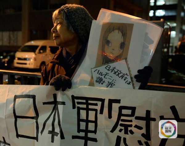 1月6日,在日本东京首相官邸前,一名市民手举“日本政府向老奶奶谢罪”的标语抗议日韩“慰安妇”协议。( 新华社记者马平摄)