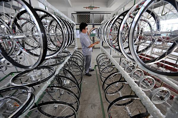 2013年6月18日,浙江宝归来车业有限公司的员工在轮轴车间里工作。该企业2012年向欧盟出口自行车,遭到反倾销调查,但最终获得抗辩欧盟反倾销的胜利。(新华社记者王定昶摄)