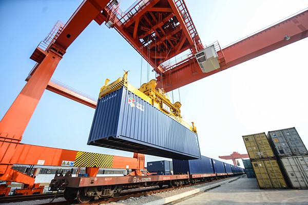 2014年11月18日,首趟“义新欧”国际货运班列在中国义乌货运站吊装集装箱。“义新欧”国际货运班列当日出发,穿越7个国家,开往西班牙马德里市。(新华社记者徐昱摄)