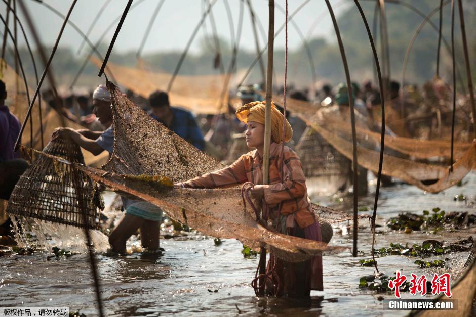 当地时间1月14日,印度古瓦哈蒂民众庆祝Bhogali Bihu丰收节,村民在湖中捕鱼。