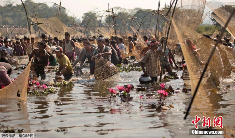 印度民众庆祝丰收节 集体下湖捕鱼(高清组图)