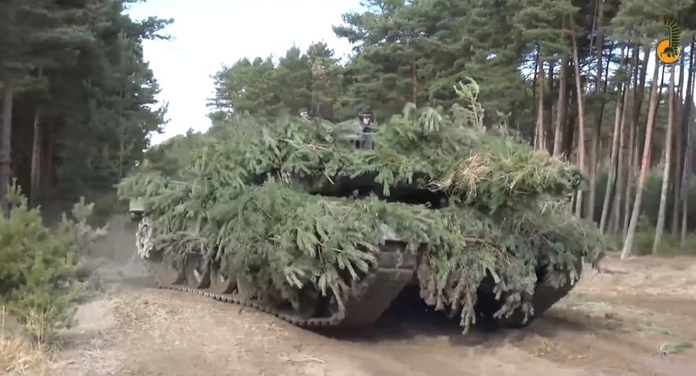 在森林中进行伪装作战训练的豹2坦克,伪装效果十分到位。