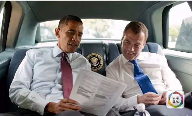 与打着温莎结的梅德韦杰夫在一起。奥巴马用缠绕较少的四手结,梅德韦杰夫用缠绕较多的温莎结,可是下端都还挺合适,所以,谁的个子高呢?(“梅姐夫”的身高不知道的退下自行搜索)