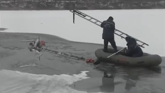 乌克兰一对男女掉进冰湖中 救援人员破冰营救(组图)