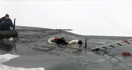 乌克兰一对男女掉进冰湖中 救援人员破冰营救(组图)