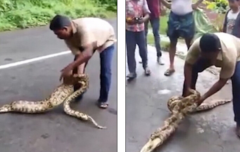 据英国《每日邮报》1月14日报道,印度喀拉拉邦(Kerala)的高速路上发生了令人震惊的一幕:一名农民赤手空拳捉住一条2米长的活蟒,并使劲将它刚刚吞入腹中的2只小山羊从蛇口挤压了出来。