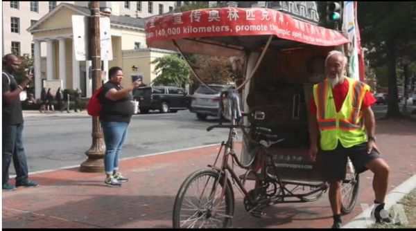 据美国之音电台网站1月12日报道,华盛顿国家广场街头驶来一辆三轮车,骑车人时不时得推车前行,遇见美国人,他只能笑笑,遇见中国游客,他就打开了话匣子: