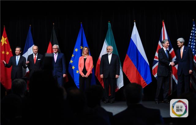 2015年7月14日,伊朗核问题六国与伊朗经过近两年谈判,达成解决伊核问题的全面协议。中国外交部长王毅、法国外长法比尤斯、德国外长施泰因迈尔、欧盟外交和安全政策高级代表莫盖里尼、伊朗外长扎里夫、英国外交大臣哈蒙德、美国国务卿克里(从左至右)在新闻发布会前出席集体合影仪式,俄罗斯外长拉夫罗夫缺席。 (新华社记者钱一摄)