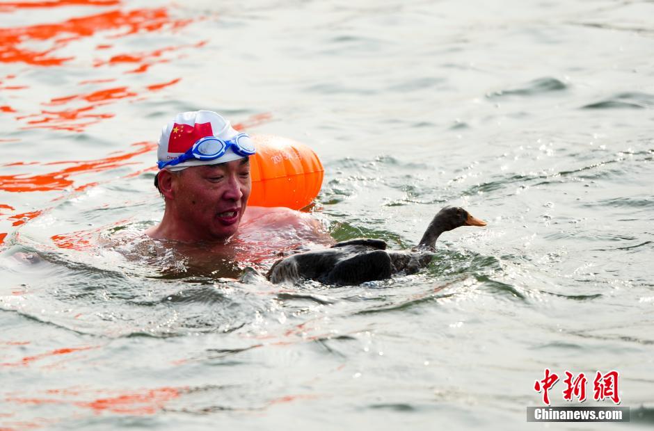 1月16日,冬泳健儿水上捉鸭。当日,“第五届济南国际泉水冬泳节”在大明湖畔举行,来自中国、美国、俄罗斯、英国、法国以及台湾等18个国家和地区的800余人冒严寒横渡大明湖。中新社记者 张勇 摄