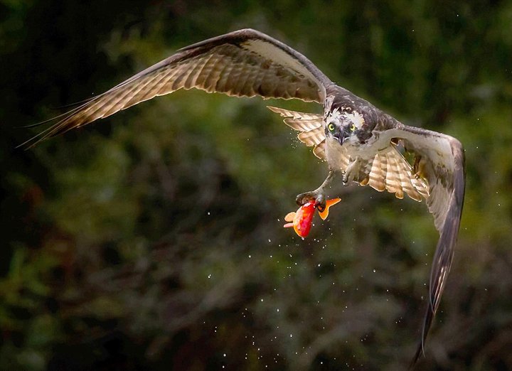 据英国《每日邮报》1月14日报道,谈到鱼鹰,你可能会想到野外那展翅翱翔、威风凛凛的天生猎人。近日,加拿大摄影师拉梅什 钱德拉(Ramesh Chandar)在多伦多市中心一个池塘旁用镜头捕捉到了一只鱼鹰优雅地擒获猎物,伴着飞溅的水花胜利凯旋的场景。
