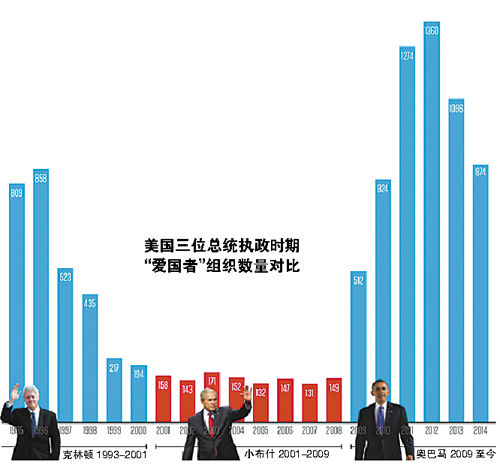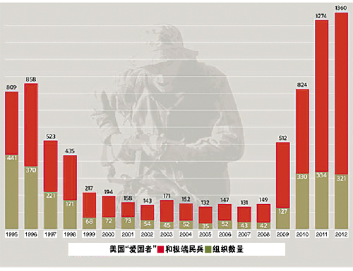 专门研究美国极端民兵组织的美国南方贫困地区法律中心的统计数据显示,从2002年至2012年,美国“爱国者”民兵组织数量增长了八倍多,从150个增加到1360个。