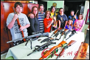 美国密歇根州居民李·米洛考(左三)和妻子及八个孩子每月都会在农场进行持枪军演,以迎接可能到来的“外敌入侵”。